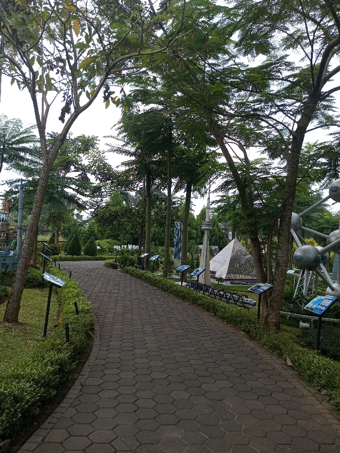 The scene depicts an outdoor park in Tân Kỳ Commune, Vietnam. A dark gray hexagonal paver pathway curves through the center of the image, starting from the lower left and extending towards the upper center-right. The pathway is flanked on both sides by manicured green grass and low, dense green shrubbery forming hedges. Numerous trees with green foliage of varying density and species are present throughout the area, framing the path and extending into the background. Several tall, slender trees line the right side of the path, while broader-canopied trees are visible on both sides and in the distance. Along the pathway, at least ten small information plaques, featuring blue and white panels on black posts, are visible, presumably providing details about the exhibits. The park contains miniature replicas of famous global landmarks. On the far left, a multi-domed structure is partially obscured by trees. Towards the mid-right, a tall, slender replica resembling the CN Tower stands near a silver, pyramidal structure. On the far right, a prominent silver atomic-like sculpture, resembling the Atomium, is visible. In the background, center, a large white sign with dark lettering spelling "HOLLYWOOD" is visible amidst the trees. No individuals are present in the depicted scene. The lighting suggests an overcast or diffused daytime condition.
