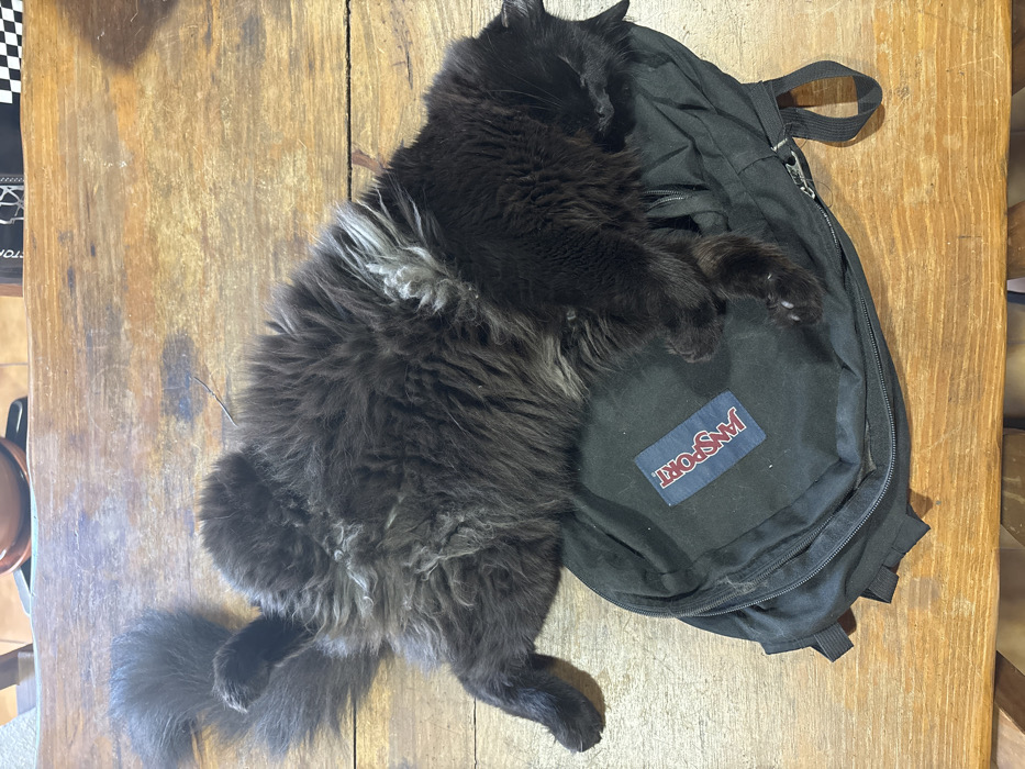 - "A fluffy black cat sprawls on a wooden table, draped across a black JanSport backpack" by FM-Smlq53, licensed under CC BY 4.0