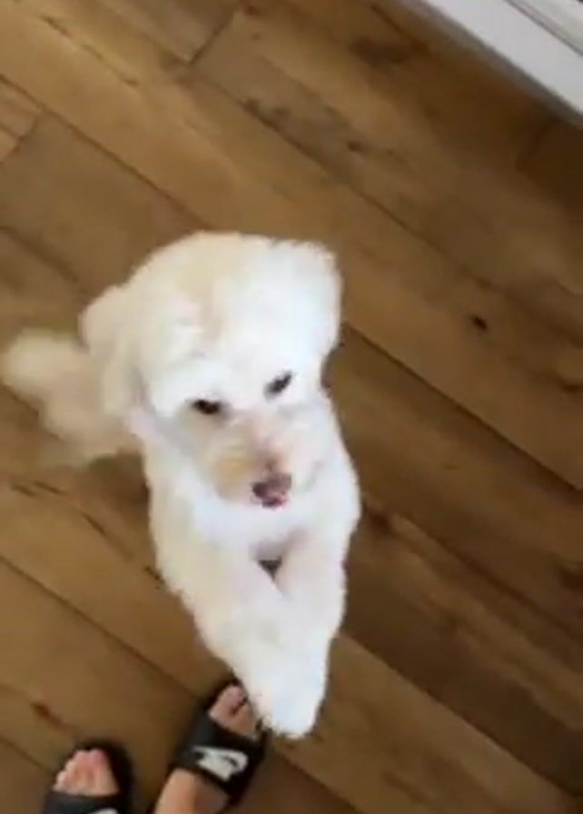A person with bare legs and black Adidas slides is standing on a wooden floor. A small white dog sits and looks up at the person. The person holds a small piece of orange food, offers it to the dog, and the dog eats it. Behind the person, a white cabinet is visible.