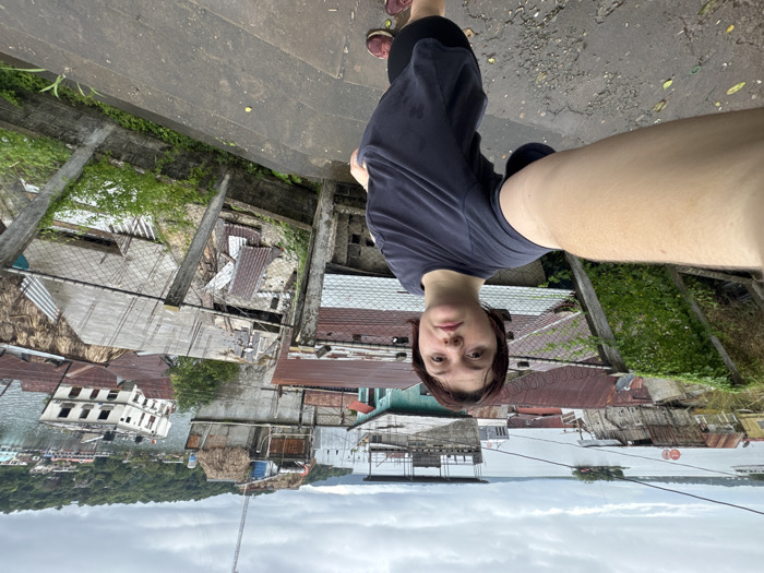 A female individual with short, dark hair, wearing a dark short-sleeved top and dark bottoms, stands on wide concrete steps, holding a camera in her extended right arm, facing the viewer for a selfie. She stands on an elevated position within the city of Flores, Guatemala, overlooking Lake Petén Itzá. Below the individual, a dense residential area built on a slope is visible, characterized by tightly packed structures with varied roof types, including corrugated metal (red and grey) and flat concrete. Some buildings exhibit signs of wear or dilapidation. Chain-link fences with concrete posts, topped with barbed wire on the left, separate the stairway from these dwellings. Green vegetation, including vines, covers parts of the slope and fences. In the background, the expansive Lake Petén Itzá is visible under an overcast sky. A small, vegetated island is situated in the lake to the left. Along the distant shoreline, additional buildings and several boats or boat-like structures are present, notably a large, multi-story white vessel that appears heavily tilted or partially submerged on the right side of the frame. Utility lines crisscross the upper portion of the scene.