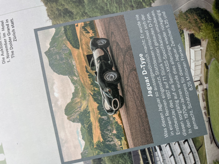 The image displays a close-up, slightly angled view of a printed page, likely from a magazine or brochure. The central feature is a large photograph of a black and off-white Jaguar D-Type classic sports car, depicted from a low angle on an asphalt road. The car, a two-seater with an aerodynamic profile and covered headlights, faces towards the left. Its background consists of rolling, verdant mountains under a partially cloudy sky, suggesting an alpine or hilly setting. Below this car image, a grey box contains the title "Jaguar D-Type" in white text, followed by a detailed German description. This text explains that the car was never raced, was carefully converted to a Semi-XKSS specification in 1957 by its first owner, and was reverted in the 1970s. It also states an estimated value between 5.25 and 6.25 million Swiss Francs. In the upper right corner of the printed page, German text indicates that an auction will take place on "1. November im Hotel The Dolder Grand in Zürich" (November 1st at Hotel The Dolder Grand in Zurich). The lower portion of the page, visible beneath the main car article, features a secondary printed image. This image displays the distinctive modern, terraced architecture and landscaped grounds of a large building, which is identifiable as the Hotel The Dolder Grand, thereby visually confirming the specified location in Zurich, Switzerland. The printed page itself is off-white and appears to be lying on a light-colored surface.