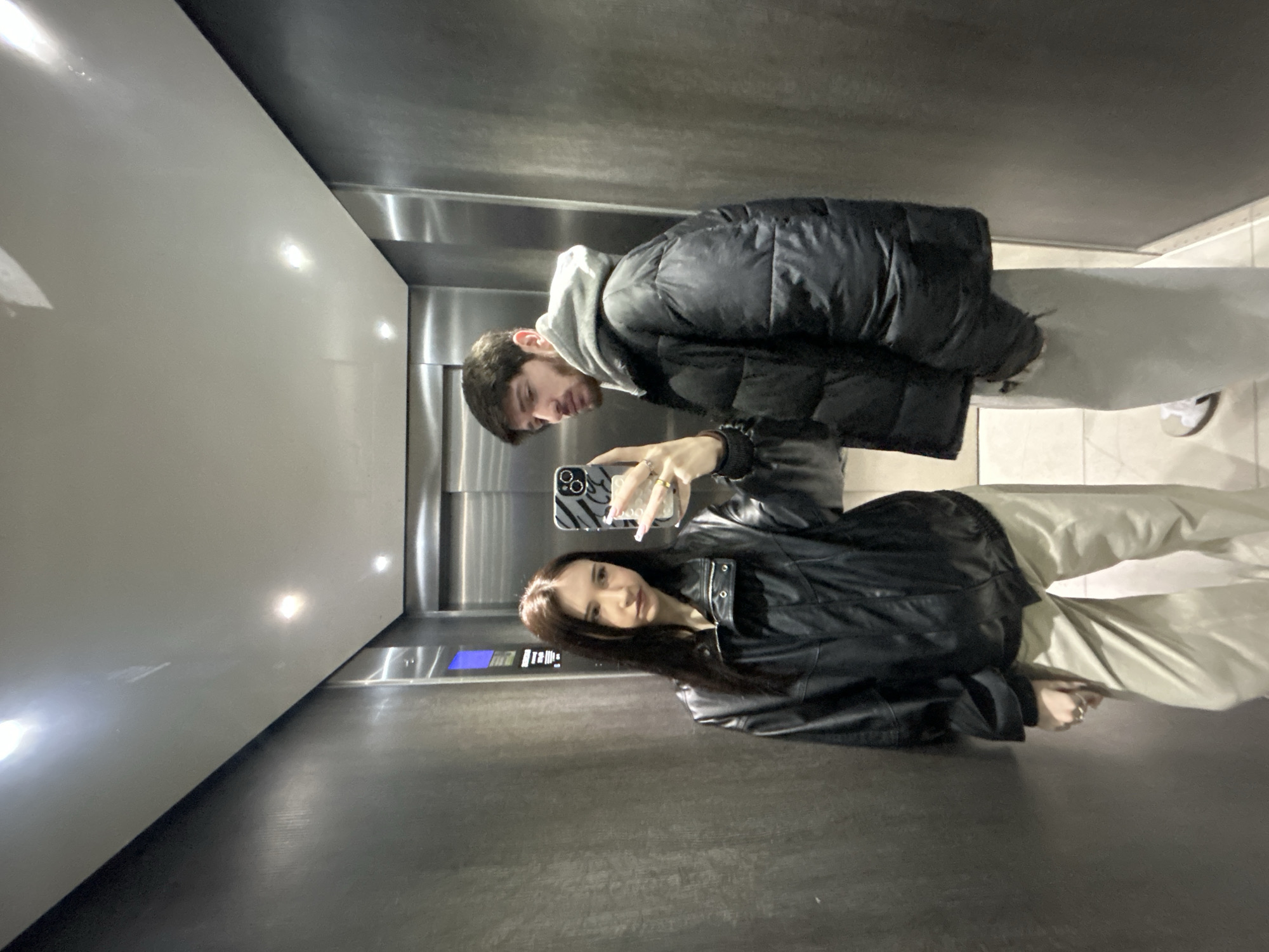 A man and a woman are taking a selfie in an elevator. The man is wearing a black puffer jacket with a gray hoodie underneath and light gray pants. The woman is wearing a black leather jacket and light-colored pants. The elevator has silver walls and lighting fixtures in the ceiling. The setting appears to be a modern building in Cachan, France.