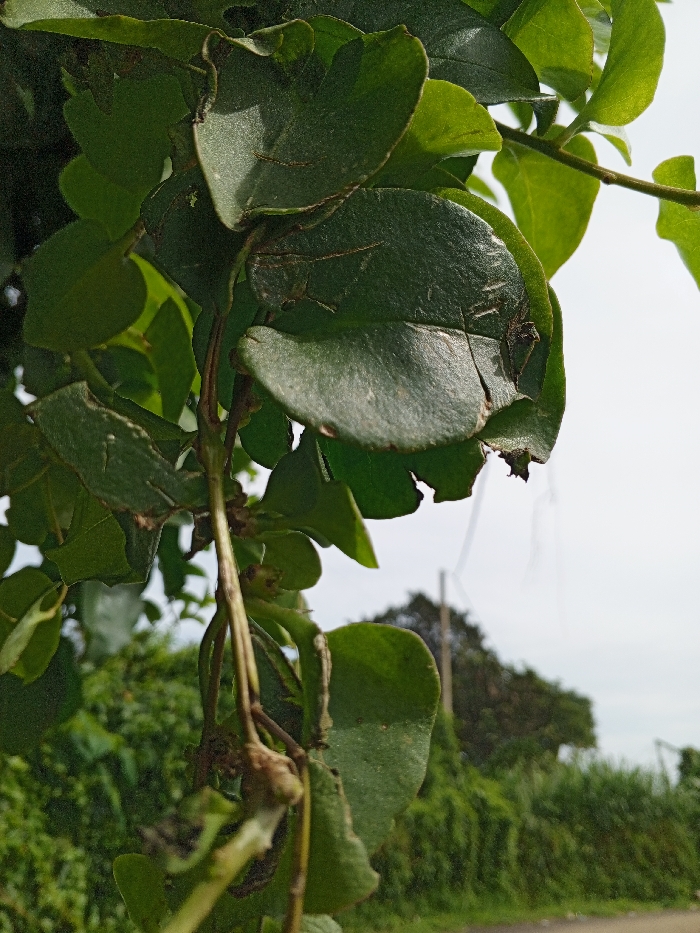 Lush green foliage dominates the foreground, showcasing thick, round leaves with minor imperfections. A slender, brown vine interweaves among the leaves. The background features a blurred landscape with a distant tree and a hazy, overcast sky. The scene suggests a natural, possibly overgrown environment.