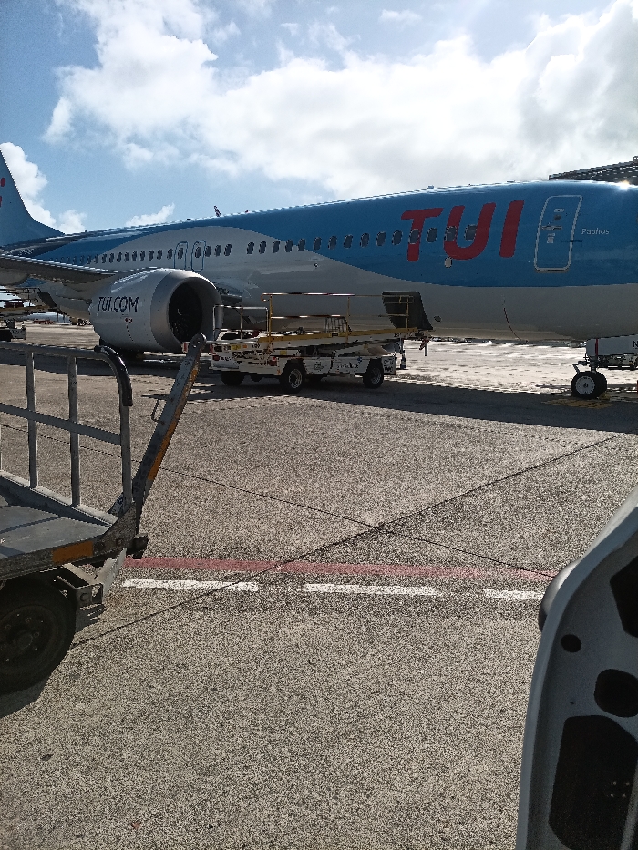 The image displays an airport tarmac scene at Gran Canaria Airport (GCLP) in Las Palmas de Gran Canaria, Spain, under a partially cloudy daytime sky. A TUI branded aircraft, featuring a light blue and white livery with "TUI" in red capital letters on its fuselage and "TUI.COM" on its engine nacelle, is the central subject. The word "Paphos" is visible on the aircraft near a passenger door. A cargo hold door on the underside of the fuselage is open. Adjacent to this opening, a white and yellow ground service baggage loader is positioned. In the foreground, a grey metal baggage cart, showing a black wheel and part of its side frame, is partially visible on the left. The asphalt tarmac is marked with white and faded red operational lines. No personnel are visible within the frame.