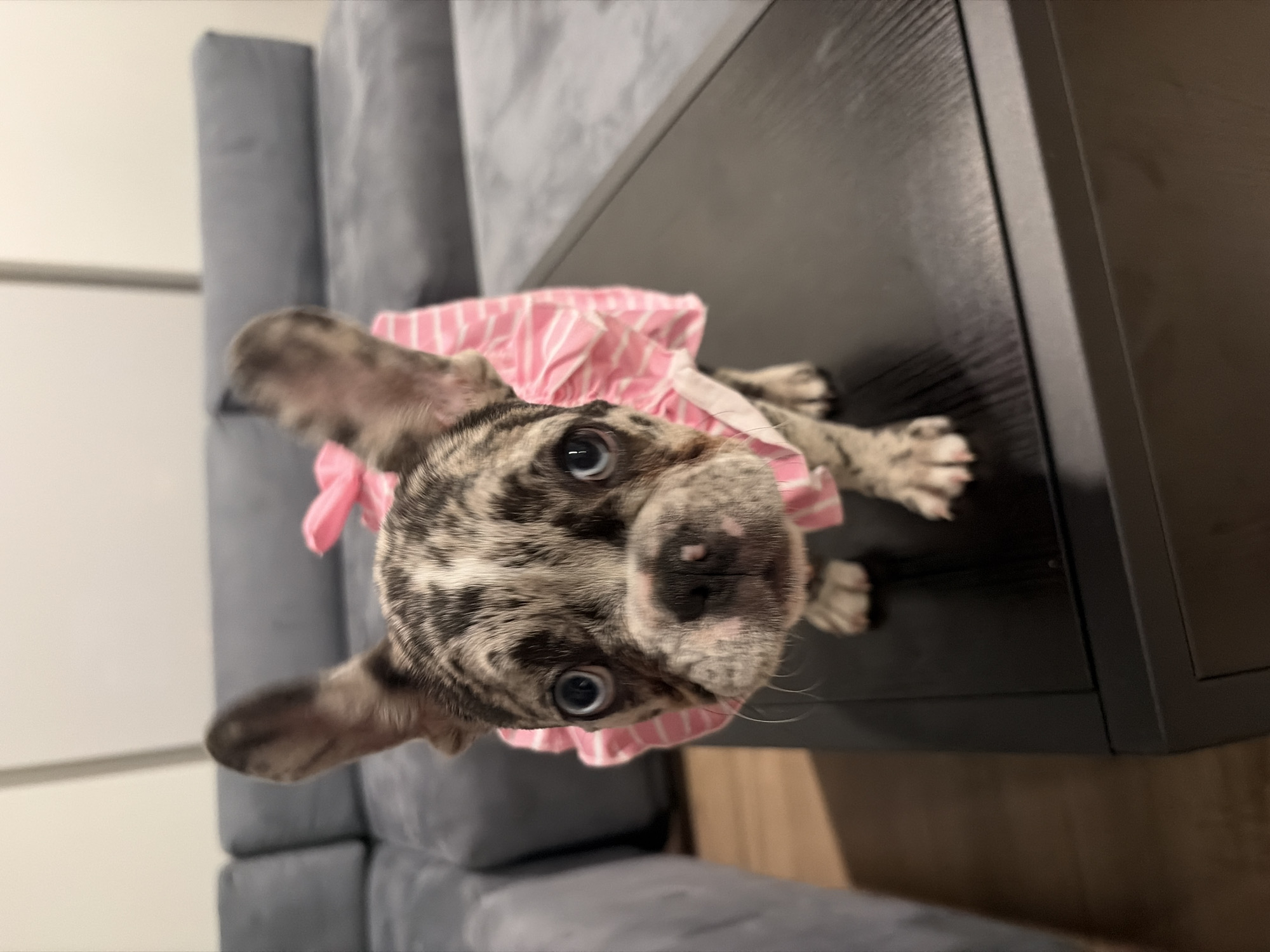 A merle French Bulldog puppy, displaying a speckled black, white, and grey coat with distinct blue eyes, stands centered on a dark, flat rectangular surface. The puppy is outfitted in a pink and white striped garment, featuring a pink bow on its dorsal side. Behind the puppy, a grey sectional sofa is present, set against a light-colored wall. The scene is illuminated by indoor ambient lighting. This incident occurred in a residential interior located in Austin, United States of America.
