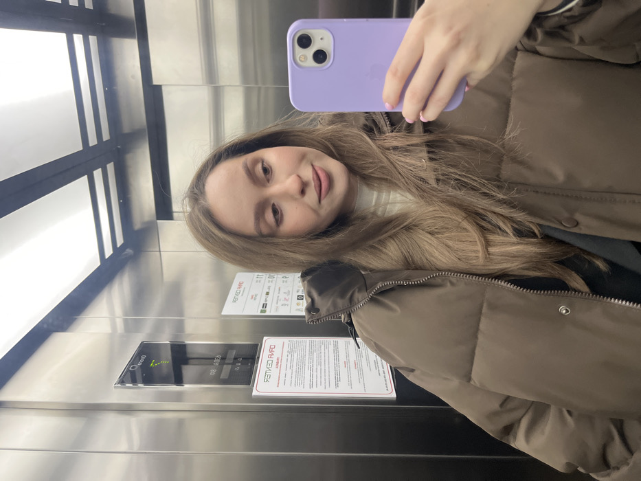 A young woman takes a selfie in an elevator. She is wearing a brown puffer jacket over a white turtleneck sweater. Her long, light brown hair falls to her shoulders. She's holding a purple smartphone in her right hand. The elevator has brushed metal walls, a digital floor display showing the floor number as "1," and an informational poster on the wall. The elevator's ceiling grid is visible.