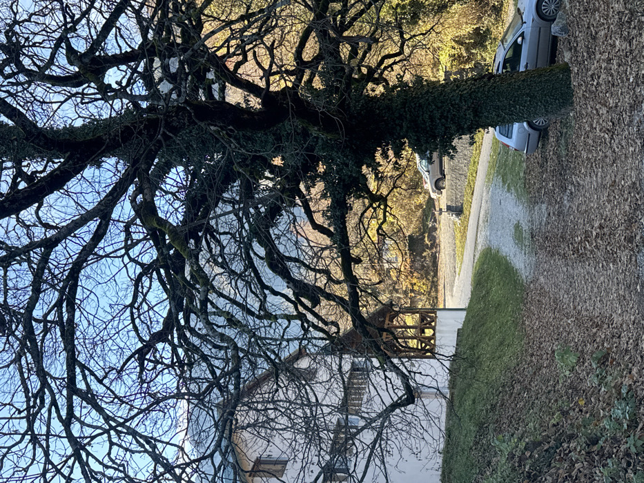 The image depicts a static outdoor scene in a rural area of Bistrica, Montenegro, during daylight, likely late autumn or early winter, under a clear blue sky. A large deciduous tree, mostly devoid of leaves with its trunk heavily covered in dark green ivy, dominates the right foreground and midground, its bare branches fanning across the upper frame. To the left, a multi-story white building with a brown-tiled roof and multiple windows with closed wooden shutters is visible. An ornate wooden gazebo-like structure with a pitched roof is attached to the building's side. A dirt path, covered in brown fallen leaves, extends from the immediate foreground towards a gravel or paved area in the midground. A patch of green grass is present beside the path near the building. Two vehicles are visible: a light-colored SUV is parked on the paved area in the midground, facing right, and a silver station wagon (Ford Mondeo) is parked to the right of the large foreground tree, also facing right. Distant hills or mountains, partially covered with bare trees and some showing yellow-orange foliage, form the background. No individuals or animals are present.