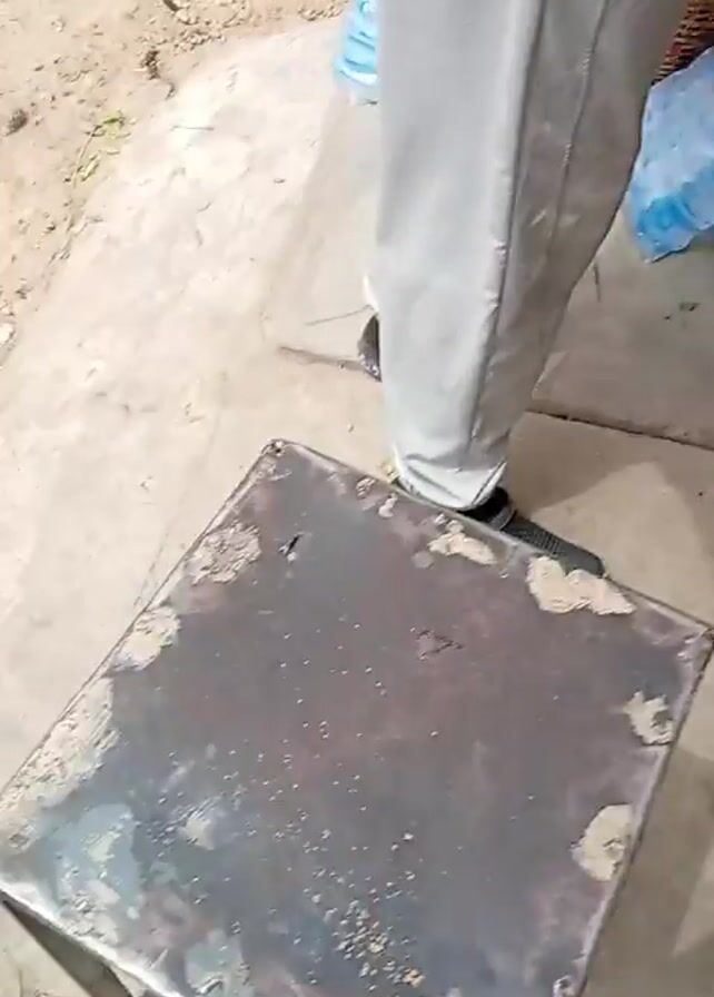 person in gray pants and a gray sweatshirt standing on a concrete surface. The person steps off a small black metal table and moves away. The camera pans to reveal a wooden table with a basket of red tomatoes on top. Underneath the table there are large rocks, a cooler, and various containers. The environment appears to be an outdoor market or similar setting.