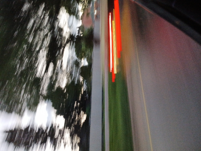 A blurry, motion-filled scene presents a blurred view of trees and sky on the left. A solid, neutral-toned barrier or structure runs vertically down the center. To the right, a blurred green field transitions into a smooth, gray surface, perhaps a road or building. Vertical red and yellow streaks suggest lights or reflections, further emphasizing the sense of speed. The angle indicates it might be a shot through a car window.