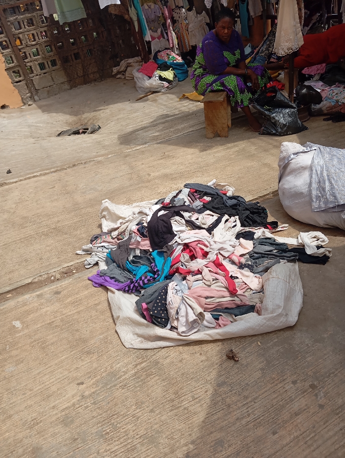 An outdoor scene in Onitsha, Nigeria, depicts a market stall. In the center-right, an adult female with dark skin and dark hair, wearing a purple and green patterned dress, is seated barefoot on a small wooden stool. She faces slightly right, with a neutral expression. In the foreground, a large, multicolored pile of clothes is spread on a white canvas or sack on the concrete ground. To the right of this pile, a bulky white sack, possibly containing more clothes, is partially visible. Behind the seated woman, numerous clothes hang from wooden structures and are piled in bags, indicative of a clothing retail setup. The ground is light-colored concrete, showing wear, with shadows cast across it. In the mid-ground left, a dark, possibly deflated tire fragment is partially embedded in the concrete. A light orange wall with a concrete block structure is visible in the background on the left.