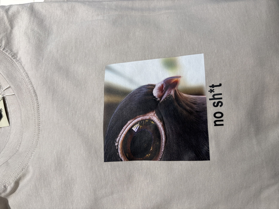 A light beige, short-sleeved, crew-neck t-shirt is displayed, folded flat and photographed from a slightly overhead perspective. Centered on the chest area is a rectangular graphic print depicting a close-up, profile view of the right side of a dark-feathered pigeon's head. The pigeon's prominent brown eye with a dark pupil reflects a multi-paned light source. The area around the eye and the cere above its pale reddish-brown beak exhibit pinkish tones. The head feathers are a dark, muted grey-black. The background within the print is a blurred composition of light green and beige. Below the graphic, the phrase "no sh*t" is printed in black, lowercase sans-serif font. The t-shirt's ribbed collar is visible at the top, along with an interior black size tag (partially visible as "XL") and an attached white retail tag secured by a plastic fastener. The t-shirt rests on an indistinct flat, light-colored surface. The specific location in Plovdiv, Bulgaria, cannot be determined from the visual information provided.