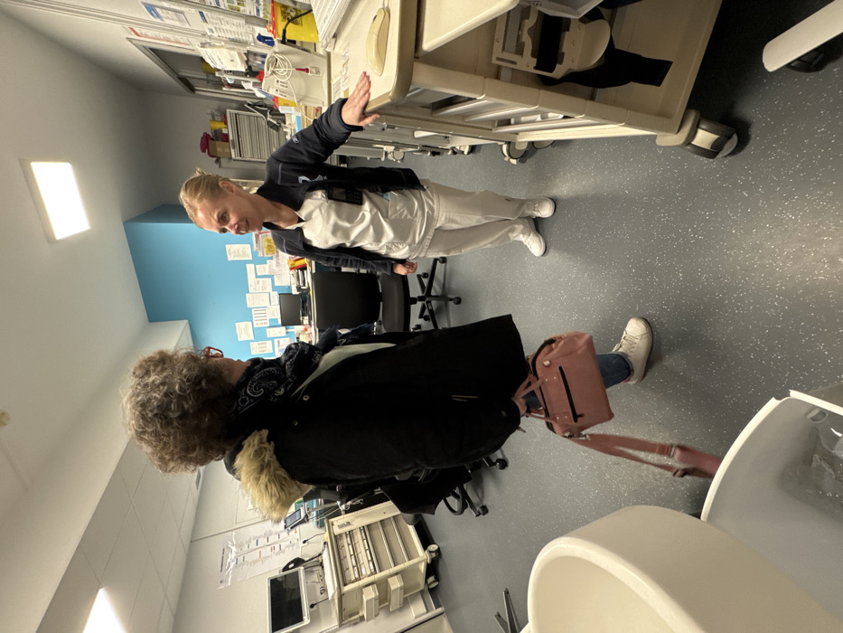 Two women stand in what appears to be a medical facility. One woman wears a white scrub uniform with a navy jacket and white shoes. She rests her hand on a rolling medical cart. The second woman is dressed in a black winter coat with a fur-trimmed hood, blue jeans, and white shoes. She also has a pink bag on her shoulder. Behind them is a light blue wall covered in papers, a desk, and a computer. The floor is speckled gray.