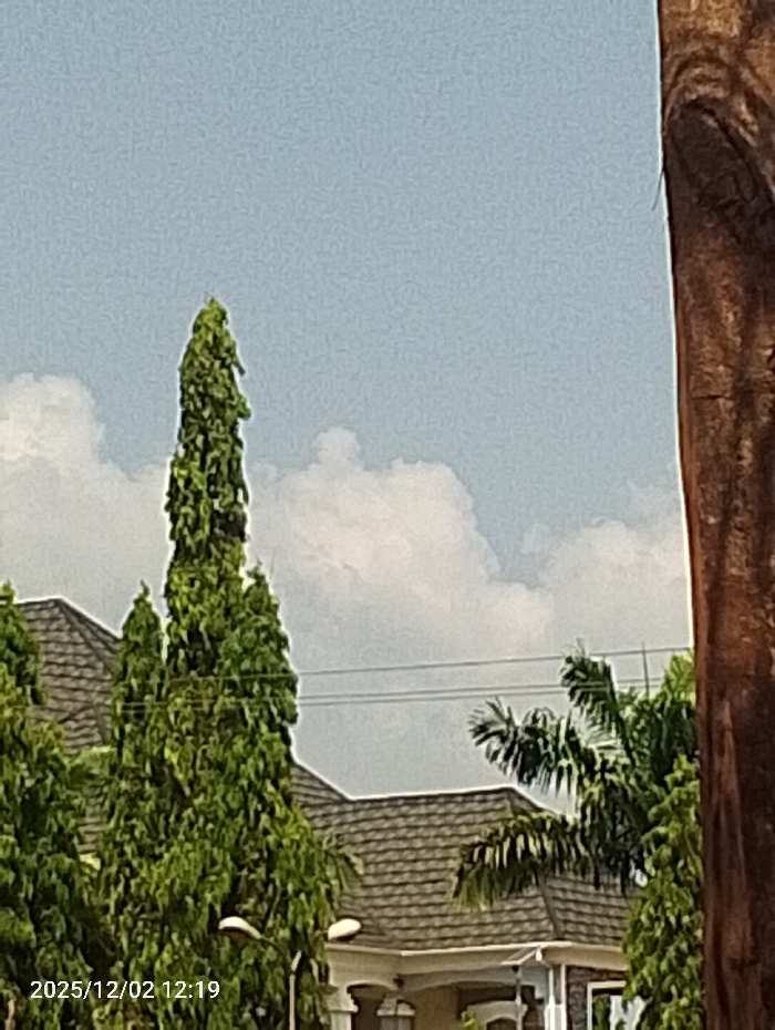 The image depicts an outdoor daytime scene in the city of Tuaniako, Nigeria, captured on 2025/12/02 at 12:19. The sky is light blue with scattered white cumulus clouds. A tall, slender, dark green coniferous tree dominates the central-left foreground, extending upwards towards the sky. Multiple residential rooftops with dark shingled surfaces are visible in the mid-ground. Utility lines traverse horizontally across the upper mid-ground, positioned above the rooftops. Other green foliage, including sections of palm-like trees, is visible on the right and in the lower foreground. A street light with two white lamps is partially visible in the lower-left. A large, rough-textured brown object, consistent with a tree trunk or wooden pole, partially obscures the far right edge of the frame. No individuals or discernible actions are present in the image.