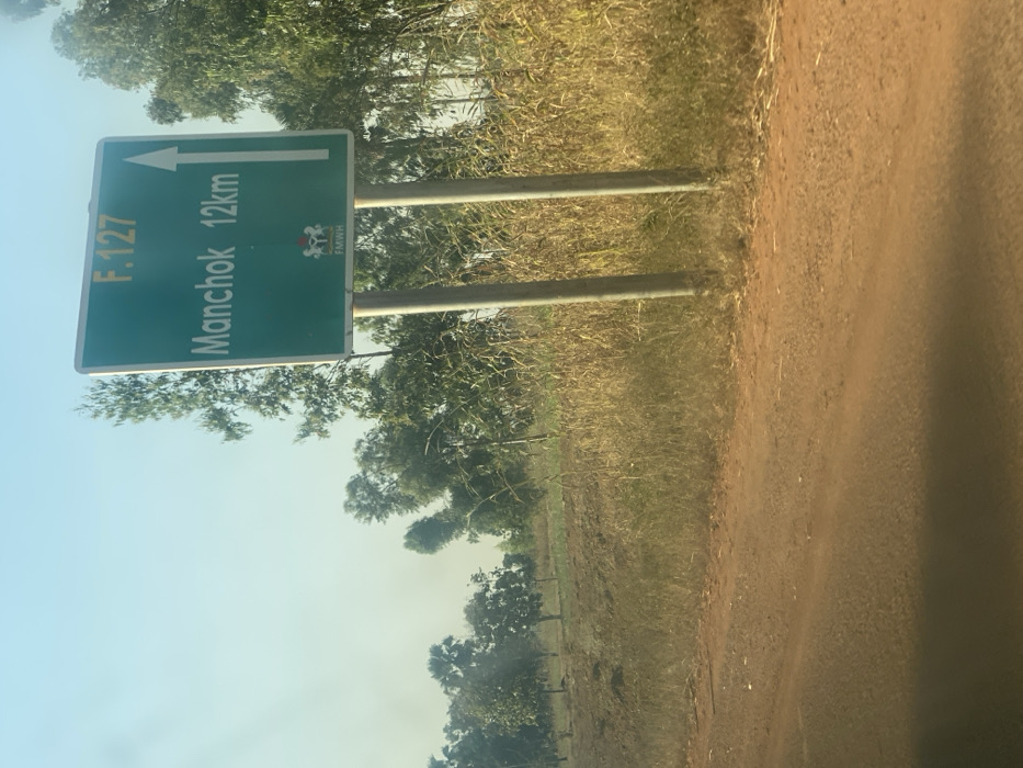 A road sign indicates "Manchok 12km" with an arrow pointing left, labeled "F.127". It's a green sign with white lettering and sits beside a dusty road. The sign is supported by two metal posts. Dry grass and trees form the backdrop. The sky is visible above the trees and appears hazy. The road surface is a reddish-brown dirt.