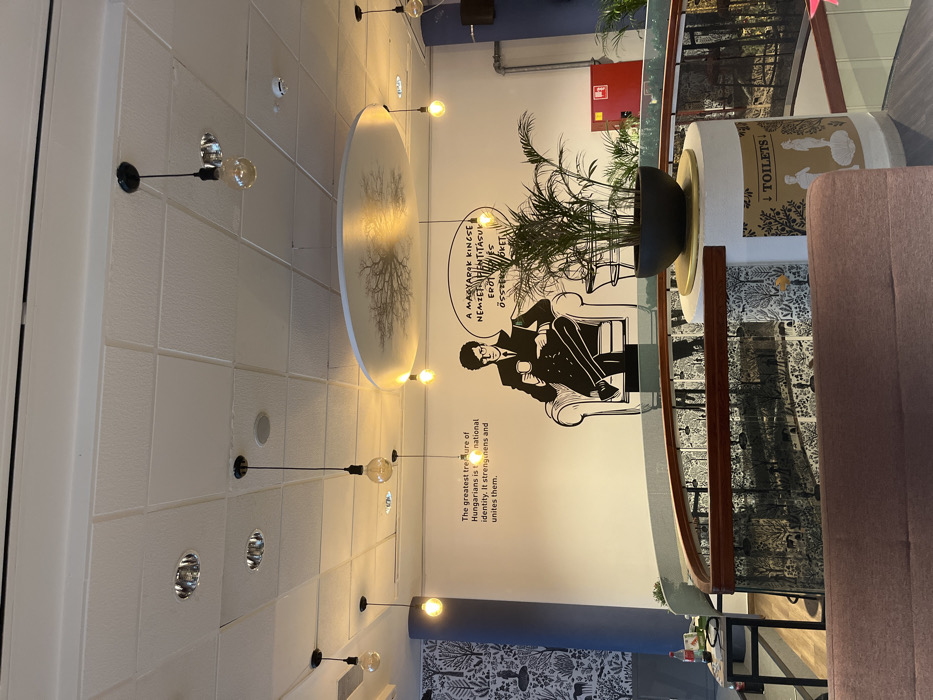 This image captures the interior of a cafe or restaurant, identified as the "Karpathy Geza" cafe, located within the Fény Utcai Piac (Fény Street Market) in Budapest, Hungary. The perspective is from an upper seating area overlooking a lower level. The ceiling features white, square acoustic panels with numerous recessed spotlights and multiple pendant lights equipped with exposed spherical incandescent bulbs. A large, circular decorative disc, adorned with a metallic-appearing tree-like pattern, is suspended from the ceiling. A prominent white wall showcases a large black-and-white mural. The central element is a stylized caricature of Géza Kárpáthy, depicted as a man wearing glasses and a suit, seated in an armchair, and holding a coffee cup. To the left of the caricature, text in English reads: "The greatest treasure of Hungarians is their national identity. It strengthens and unites them." To the right, the same quote is presented in Hungarian: "A MAGYAROK KINCSE NEMZETI IDENTITÁSUK ERŐSÍTI ÉS ÖSSZEKÖTI ŐKET." To the left of the mural, a wall section is covered with dark wallpaper featuring an intricate white botanical pattern. This pattern is also visible on the glass panels of a curved railing, which has a dark wooden handrail and separates the upper area from the lower floor. In the foreground, a segment of a reddish-brown upholstered bench is visible. A cylindrical white pillar supporting the railing on the right features a sign pointing downwards with an arrow, indicating "TOILETS" in English, accompanied by stylized figures. This pillar is topped with a large black bowl-shaped planter containing green foliage, resting on a circular golden base. On the far left, a small table holds a red bottle and other items. A red fire extinguisher cabinet is mounted on the far right wall, with visible silver piping above it. No individuals are present in the scene.