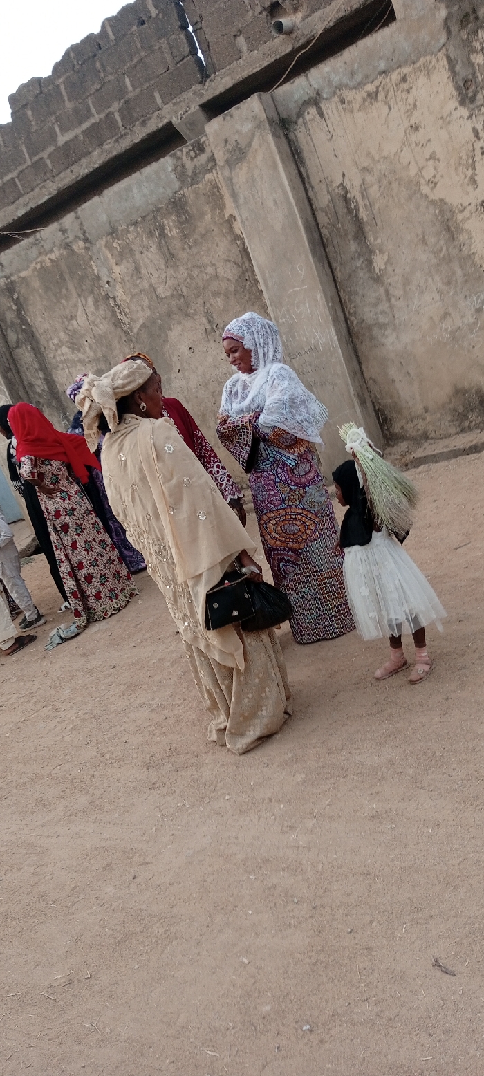 Several individuals, mostly women and a young child, are gathered outdoors. Some women wear traditional headscarves and colorful, patterned dresses. One woman holds a black purse. A young girl in a white dress and black top carries a bundle of sticks. The background includes a weathered concrete wall and a patch of dirt. The atmosphere appears to be social or celebratory.