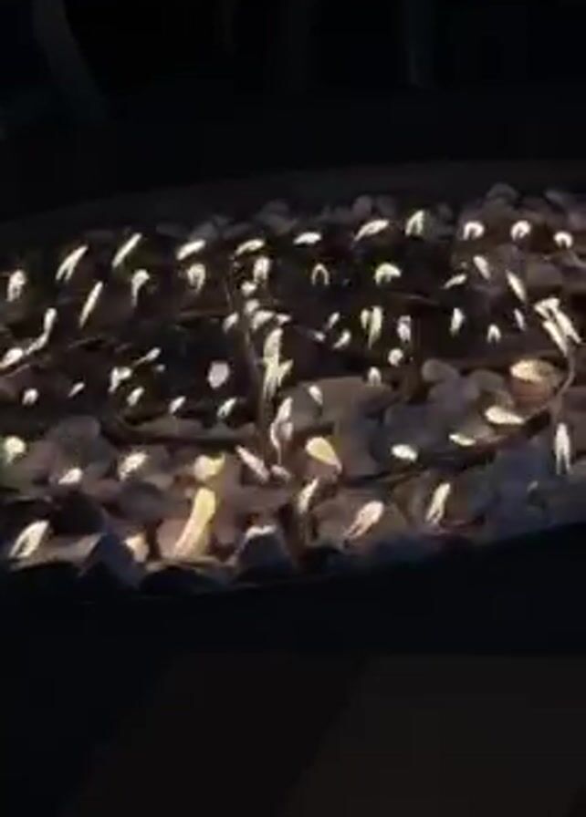 fire pit filled with white stones and flames dancing between them. The fire is relatively low, providing soft, flickering light in the dark environment. Parts of some chairs are visible in the background.