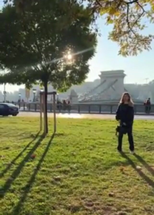 woman standing on a grassy field with a tree on the left side of the frame, the sun shining through its branches. Behind the woman is a roadway with cars and people and further back, a large bridge structure. The woman appears to be holding an object in her hand, and her shadow is cast on the ground. The sky is blue.