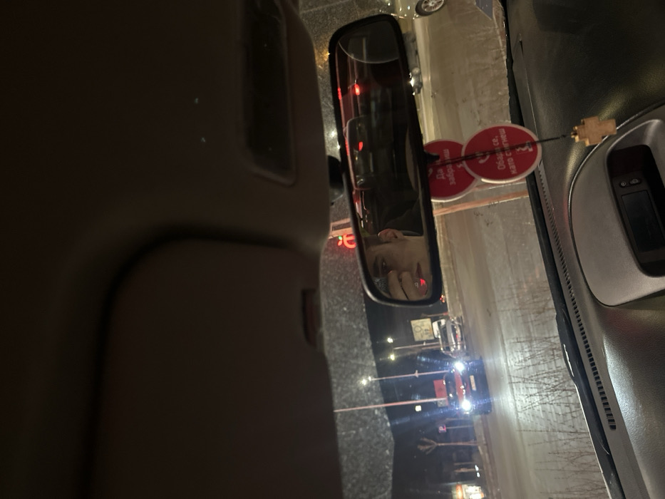 The image depicts an interior view from a vehicle at night, looking out through the windshield onto an urban street scene in Sofia, Bulgaria. **Interior Scene:** The upper frame shows the beige headliner and a sun visor of the vehicle. A rearview mirror is centrally positioned, reflecting the upper face of a person, likely male, with short dark hair and a portion of their left hand, possibly holding a mobile device. Below the rearview mirror, two circular red air fresheners or decorative items are suspended. The lower visible item displays Bulgarian text: "Обади се, като стигнеш" (Call when you arrive). A small wooden cross hangs beneath these items. The lower part of the image shows the grey and silver dashboard, including the central console area. The windshield appears to have some moisture or dirt accumulation, particularly visible at the top. **Exterior Scene:** Outside the vehicle, a multi-lane asphalt road is visible, appearing damp and reflective of lights. Directly ahead, a dark-colored sedan with bright headlights is stationary in an opposing lane. Another lighter-colored vehicle is visible behind it. In the distance, multiple streetlights illuminate the area. To the left, a pole with a 'P' parking sign and another indistinct sign is visible. Commercial buildings line the street, with illuminated signs, including a green cross, indicative of a pharmacy, reflecting a red glow in the rearview mirror. Sparse, bare vegetation, including trees and low-lying plants, is present along the roadside. The overall environment is a busy city street at night.