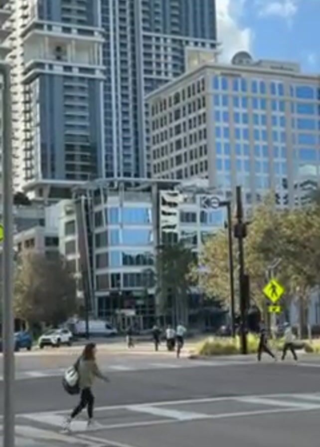 crosswalk in a city. Several people cross the street, some on foot and others on bicycles or scooters. There are tall buildings on all sides of the crosswalk, some with glass facades reflecting the sky. The weather appears sunny with blue sky and some clouds. There are trees along the street. A traffic light pole stands near the crosswalk, and a pedestrian crossing sign is visible.