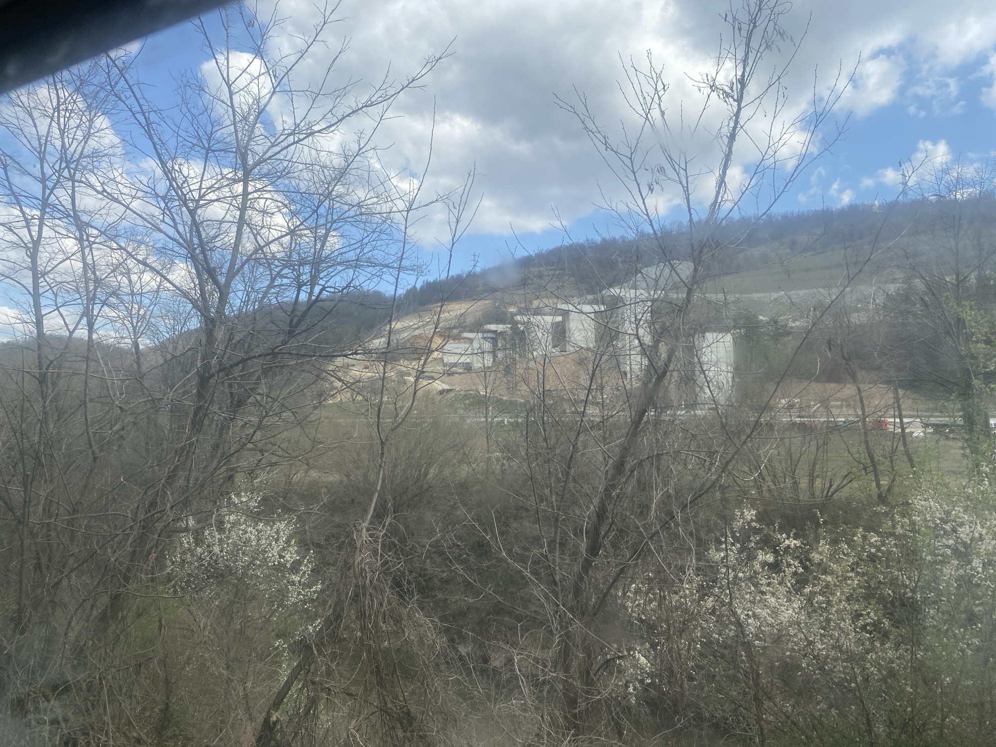 view in Gabrovitsa, Bulgaria, looking through trees and shrubs towards a construction site on a hillside. The sky is partly cloudy with blue patches. The trees in the foreground are mostly bare, with some bushes having small white blossoms. The construction site consists of large, white, rectangular structures, likely warehouses or industrial buildings, on terraced land. Earthmoving and grading are visible. A road runs along the bottom of the hill. There is no evidence of people in the frame.
