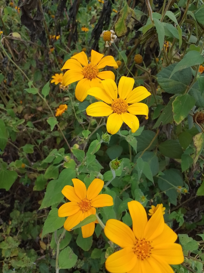 The scene, located in Ugwolawo, Nigeria, depicts a dense outdoor natural environment primarily composed of flowering plants. In the foreground and mid-ground, five prominent yellow flowers are visible, each characterized by bright yellow petals and a textured orange-yellow center. Two of these flowers are positioned in the upper-mid section, with one slightly overlapping the other. A third is located in the lower-left, a fourth is partially visible in the lower-right, and a fifth is in the upper-left. The surrounding area is densely covered with green foliage of various shades, interspersed with several closed green flower buds, particularly in the lower-middle section. In the blurred background, smaller yellow blooms are scattered, along with darker, possibly dried plant stalks and one distinct wilted, light brown flower head situated in the upper-right. No individuals, man-made structures, or specific actions are observed within the frame.