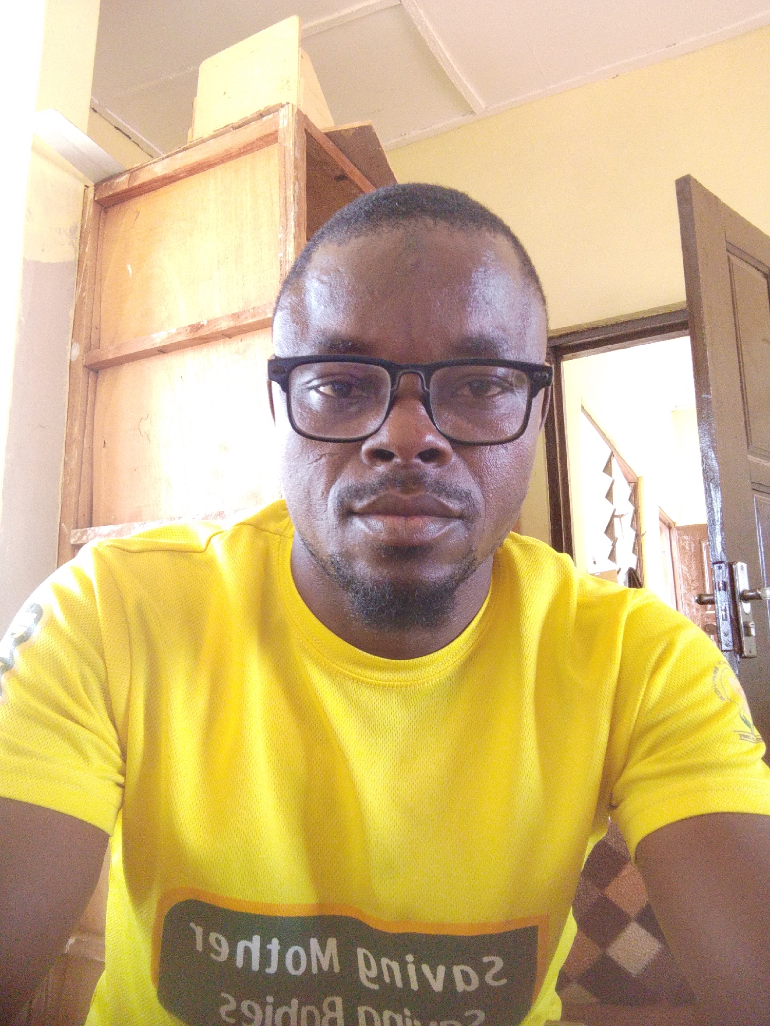The scene depicts a Black male indoors, located in Dungu, Ghana. The individual, appearing to be in his 30s or 40s, has short dark hair, a closely trimmed beard, and a mustache. He wears black-framed rectangular eyeglasses and a bright yellow short-sleeved t-shirt made of a textured, possibly mesh, fabric. An inverted and mirrored dark-colored graphic with white text is visible on the front of his shirt, partially reading "Mother Saving" on the upper line. He faces directly towards the camera with a neutral expression. The background includes a light-colored wall on the left, against which an unfinished wooden structure, possibly shelving or a partition, is visible. This structure consists of light-toned wood panels framed by darker wooden beams. To the right, a dark brown wooden door is ajar, revealing a glimpse of an adjacent room or hallway. The door features a silver-colored handle and lock mechanism. Beyond the doorway, a tiled floor with a diamond or checkerboard pattern is discernible. The ceiling is white with visible panel seams. Natural light illuminates the subject and the immediate environment.