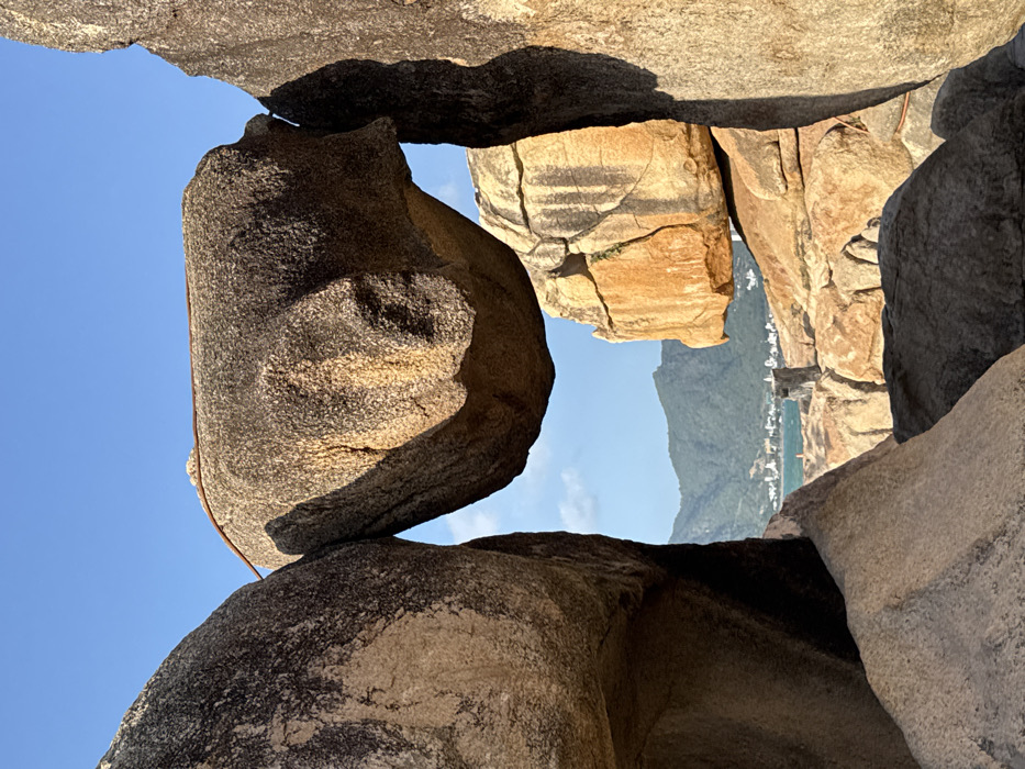 The image depicts a natural coastal rock formation at Hon Chong Promontory in Nha Trang, Vietnam, under a clear blue sky. The foreground and midground are dominated by massive, irregularly shaped granite boulders with varied textures and colors ranging from dark grey-brown to reddish-orange. A large, dark grey-brown boulder on the left frames the scene, converging towards a central, precariously suspended boulder that forms a natural archway. This central boulder, also dark grey-brown, exhibits an uneven underside and a flatter top surface. A thin, reddish-brown line, consistent with a cable or rope, is visible running across the top-left edge of this suspended boulder and partially onto the adjacent left boulder. A third large boulder on the right side completes the framing, partially obscuring the view. Through the opening formed by these boulders, additional reddish-orange and grey boulders are visible on the ground, some appearing balanced. In the distant background, a body of water (likely the South China Sea or Nha Trang Bay) is visible, bordered by a strip of white and light-colored buildings representing a distant cityscape. Further behind, a range of green, vegetated mountains rises under the clear sky. No individuals or active interactions are visible within the scene. Strong sunlight from the left casts distinct shadows on the boulders.