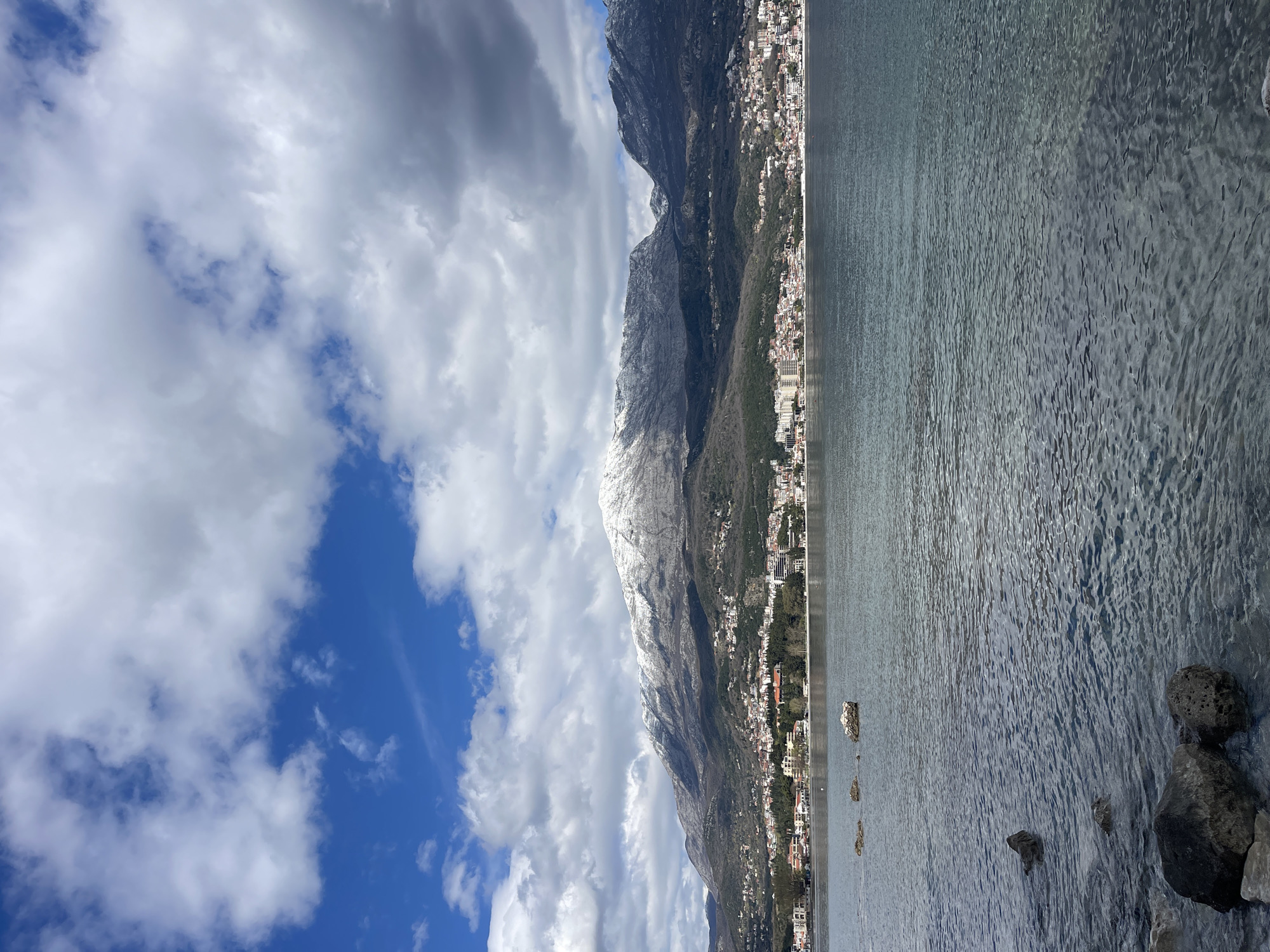 The image is a landscape scene featuring a mountain range covered in snow, a body of water, and a sky with cumulus clouds. The mountain range occupies a significant portion of the image, running from the top to the bottom. The lower slopes of the mountains are sparsely covered with vegetation and buildings. A town with closely packed buildings extends from the shoreline up the lower slopes. The body of water appears calm. The sky is filled with white cumulus clouds with patches of blue sky visible. Rocks are visible at the water's edge in the foreground. The location is Provodina, Montenegro. There are no people present.