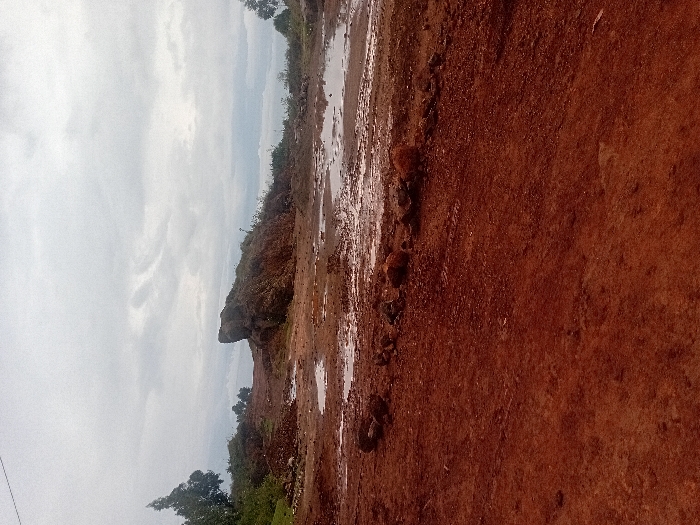 The scene, located in Ndeiya, Kenya, depicts an outdoor, rural landscape under a uniformly overcast sky. The foreground and midground consist of disturbed reddish-brown earth, extensively wet with numerous irregular puddles of standing water reflecting the grey sky. Faint tire tracks are visible on the drier sections of dirt in the lower right. A prominent, irregular rocky outcrop, characterized by exposed reddish soil and sparse green vegetation, dominates the left midground. Beyond the wet ground and rocks, the landscape presents undulating terrain with scattered green bushes and small trees extending towards a hazy horizon. No individuals, animals, or developed structures are present. The environment indicates recent or ongoing precipitation.