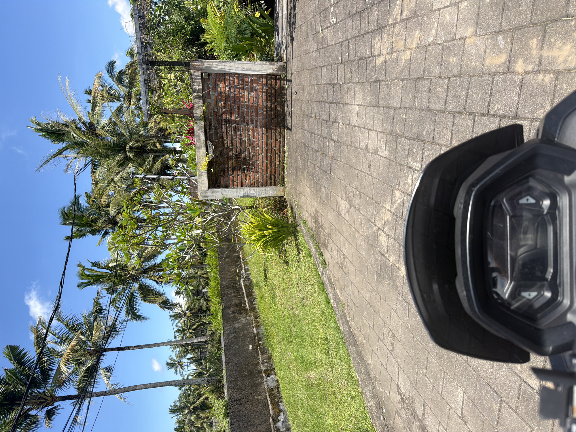 The image presents an outdoor scene in Petulu, Indonesia, under a clear blue sky with scattered clouds. Palm trees line the left side of the frame, their fronds extending towards the sky. Power lines are visible amidst the trees. A low, concrete wall runs along the edge of a grassy area, separating it from a paved walkway. A small, brick structure with a concrete frame stands along the walkway. The foreground is dominated by the front of a black vehicle, likely a scooter or motorcycle, with part of its dashboard visible.