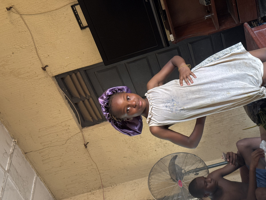 The image depicts an indoor scene in Aguata, Nigeria, featuring two individuals and household objects against a textured yellow wall