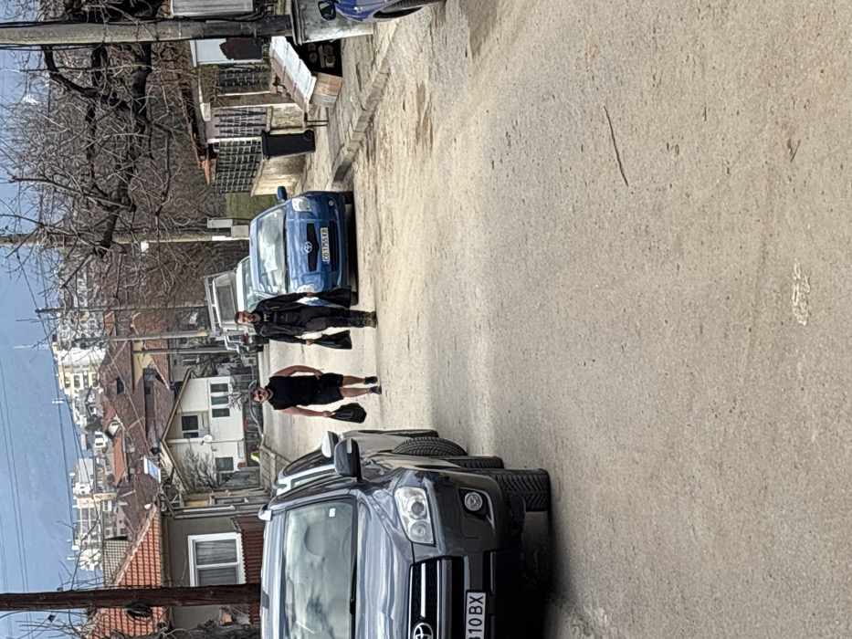 The image displays a residential street in Pirdop, Bulgaria, under an overcast sky