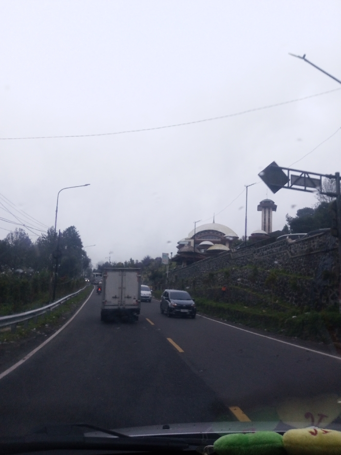 The image depicts a roadway scene on a cloudy day in Jabalpur, India, specifically along a path leading past the Bargi Road Mosque. The perspective is from the interior of a vehicle, with a portion of the dashboard and windshield visible at the bottom, displaying two plush objects (one green, one yellow/tan). The main subject is a two-lane asphalt road, extending away from the viewer. A solid yellow line divides the lanes, with a white line marking the left shoulder. Traffic flows in the same direction as the viewer. A white box truck occupies the left lane, followed by a smaller white car further ahead. A dark-colored sedan travels in the right lane, positioned to the right of the box truck. A motorcycle is partially visible behind the box truck. On the left side of the road, a metal guardrail separates the asphalt from dense green foliage and trees. A street light pole with a single lamp extends over the road, and overhead power lines are visible against the overcast sky. On the right side of the road, an extensive multi-tiered stone retaining wall, partially covered with sparse vegetation, supports an elevated area. On this elevated terrain stands the Bargi Road Mosque complex, characterized by multiple domes, including a large central dome and several smaller ones, and a tall, slender minaret to its right. Another street light pole and a partial view of an overhead diamond-shaped road sign are also present on the right. The sky is uniformly light grey, indicating heavily overcast conditions. No people are individually discernible; only vehicles are in motion.
