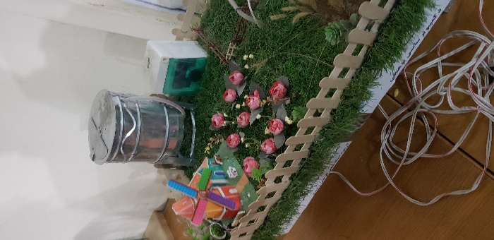 This image depicts a miniature diorama placed on a light-brown wooden surface, likely a table, against a plain white wall. The diorama features an artificial green grass landscape partially enclosed by a light-colored picket fence along its front edge. Within the diorama, a colorful miniature windmill with a red base, blue roof, and multi-colored blades is positioned on the left side. A cluster of approximately twelve artificial pink roses, each with dark green leaves, is arranged in the central area of the grass. To the right, a silver-colored, cylindrical object resembling a metal water tank or barrel stands on a dark base. Adjacent to it, a white rectangular box with a transparent green front panel is visible. Various small artificial plants and dried grass elements are integrated into the miniature landscape. In the foreground, resting on the wooden table, is a tangled coil of white and red electrical wires. No people are visible. The location is in the city of Unknown, Unknown.