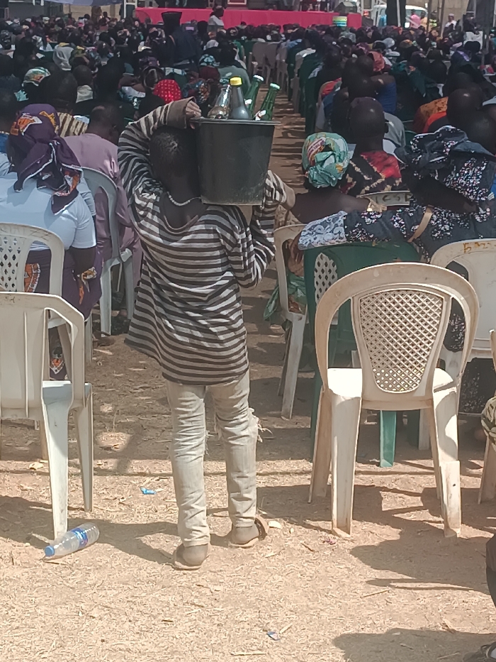 A person carries a black bucket on their head, filled with bottles. The individual wears a gray and white striped shirt, light-colored jeans with a torn knee, and sandals. They stand on sandy ground among rows of white plastic chairs occupied by a crowd of people. A discarded water bottle lies on the ground near the person's feet.