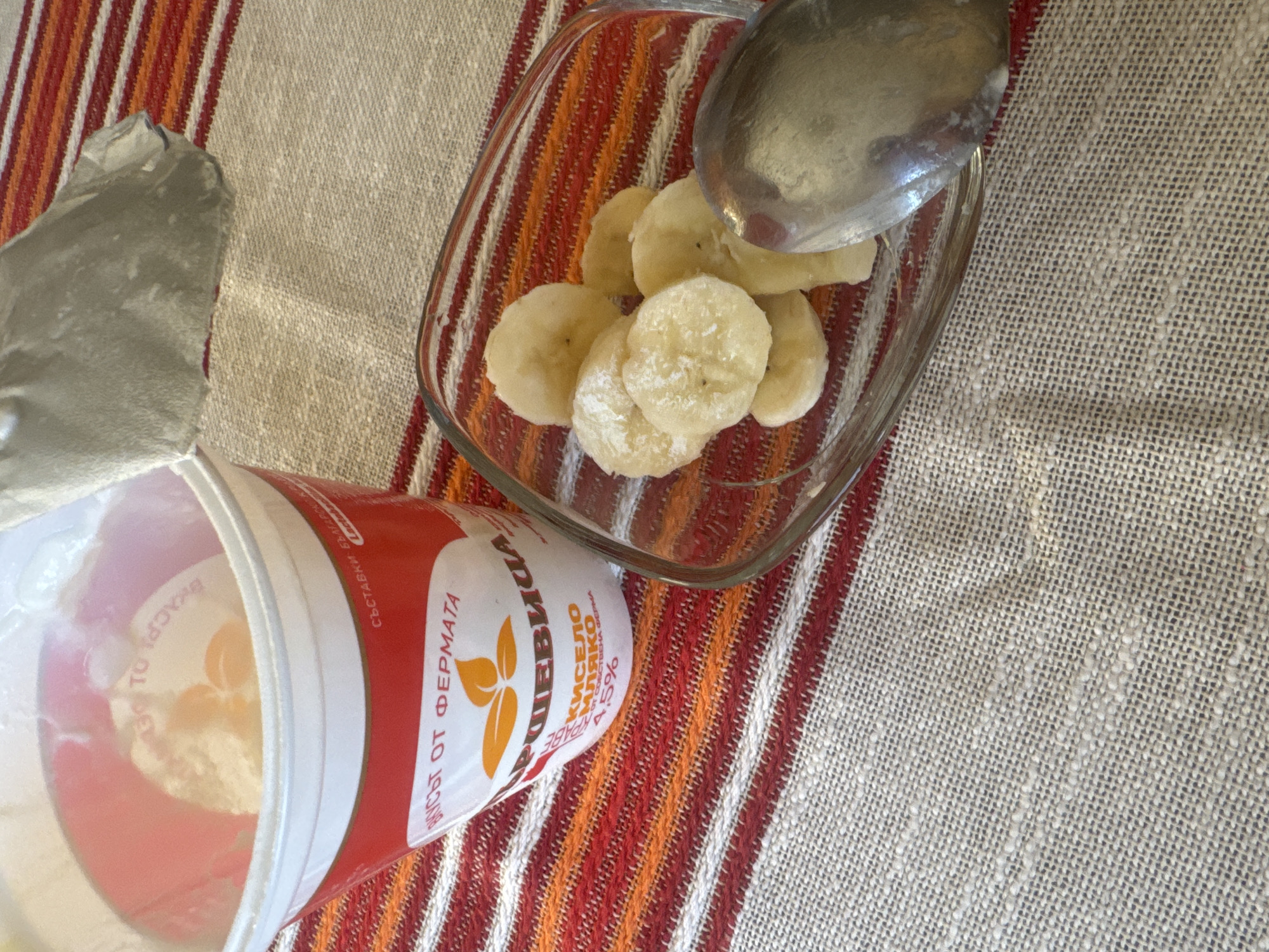 - "The image depicts a meal consisting of sliced bananas in a clear glass bowl with a silver spoon, and a partially open container of "ШЕВИЦА КИСЕЛО МЛЯКО 4" by FM-kEoge2, licensed under CC BY 4.0