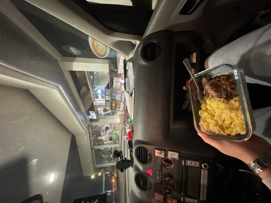 The image presents a night-time view from inside a vehicle, looking out towards a brightly illuminated Shell Select convenience store and cafe in Pavel Banya, Bulgaria. A person's left hand, wearing a silver-toned wrist watch, occupies the lower right foreground, holding a clear rectangular food container. The container holds a portion of yellow rice and a dark, textured meat patty, with a silver fork positioned within the food. The vehicle's dashboard, dark grey in color, is visible across the midground, featuring central air vents, a red hazard light button, climate control knobs, and a black phone mount. Several small, framed images are affixed to the dashboard below the central vents. Red and white decorative ribbons or fabric items are placed on the passenger side of the dashboard, adjacent to a lower storage compartment containing various indistinct items. Outside the vehicle, the Shell Select store is prominently featured, displaying its name in white lettering on a dark sign and a "cafe" sign alongside a coffee illustration. The store's interior is visible through large glass windows, showing shelves stocked with merchandise. The building is covered by a gas station-style canopy, and the general area is well-lit by artificial lights. Distant vehicle lights are discernable, indicating other vehicles in the background.