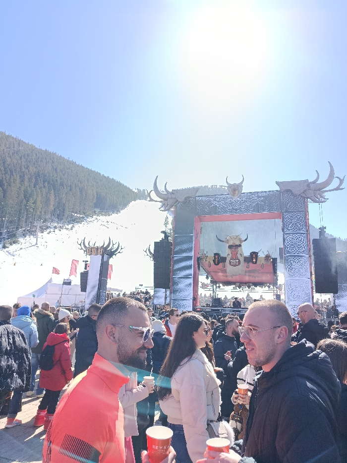 The image captures an outdoor music festival or event located on a snowy mountain slope in Bansko, Bulgaria, under a clear, bright blue sky. The central subject is an elaborate stage structure. Its frame is dark, decorated with interconnected knot patterns. Multiple sets of large, curving horns, resembling those of a bull or ram, are mounted prominently on the stage's upper frame and side pillars. A large central screen on the stage displays a stylized, horned creature's head. Black line array speaker systems flank both sides of the main stage. A platform in front of the screen holds DJ equipment and personnel. In the mid-ground and foreground, a dense crowd of people, primarily adults, is gathered. They are dressed in various winter and casual attire. Two males are in the immediate foreground, engaged in conversation. The male on the left wears a bright orange long-sleeved top and sunglasses with white frames; he holds a red cup bearing the partial label "REYKA." The male on the right wears a dark hooded jacket and clear-framed glasses, also holding a red cup, and faces the male on the left. Other individuals in the crowd are standing, observing, and holding beverages. The background features a snow-covered mountain slope rising behind the stage, bordered by a dense coniferous forest. The sky is a clear, light blue, with a strong sun flare visible in the upper right quadrant of the image, indicating sunny conditions. Additional white tent structures and red and white flags are visible among the crowd to the left of the main stage.