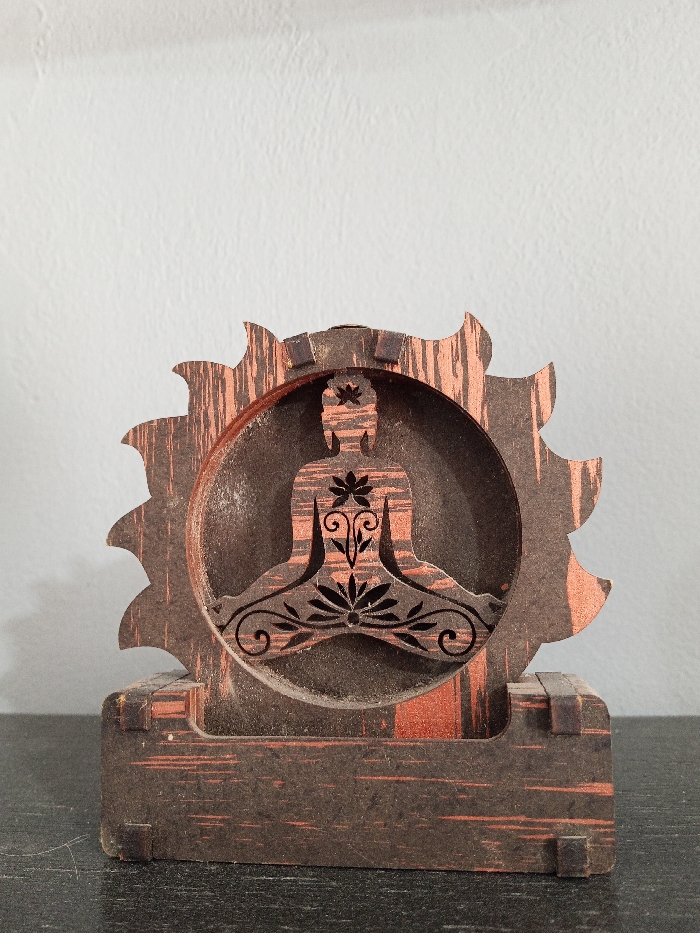 A wooden Buddha statue rests on a dark surface against a pale background. The statue, crafted from dark wood with a light, textured grain, features a circular frame with jagged edges. Inside the circle is a stylized figure of Buddha in a meditative pose, adorned with decorative floral cutouts on the body and lap. The base of the statue is rectangular and made of the same wood, with visible joints and edges.