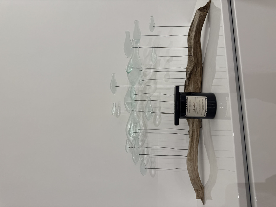 A wall art piece features a weathered branch supporting glass droplets on thin wires. A cylindrical black candle with a white label sits nestled in the branch. The art projects a clean, minimalist aesthetic with its white background, contrasting the natural elements of wood and glass.