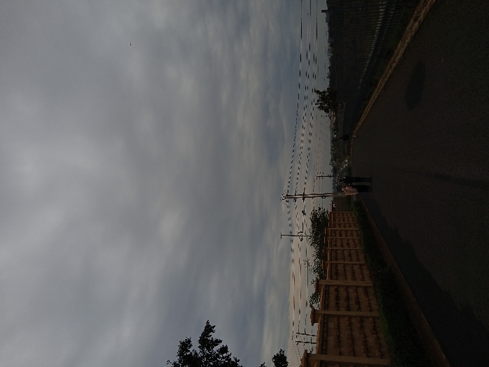 This image depicts an outdoor scene located in Witeithie ward, Kenya, under an overcast sky. A dark paved road extends into the distance, occupying the lower half of the frame. On the left side of the road, a tall, light brown, segmented privacy wall, constructed from horizontally stacked blocks, runs parallel to the road, fronted by a low row of green shrubbery. A dark tree canopy is partially visible in the upper left corner. On the right side of the road, a dark wire fence runs parallel to the path, beyond which some dark vegetation is visible. In the mid-ground, two individuals are observed walking away from the viewer on the road; one person wears lighter-colored clothing, and the other wears darker attire. A third individual is distantly visible further down the road, also walking away from the viewer. Multiple utility poles with numerous overhead power or communication lines traverse the mid-ground, with one street light fixture discernible. The sky above is entirely covered with grey clouds, displaying a subtle lighter patch near the horizon and a small, dark, unidentifiable aerial object in the upper right quadrant.
