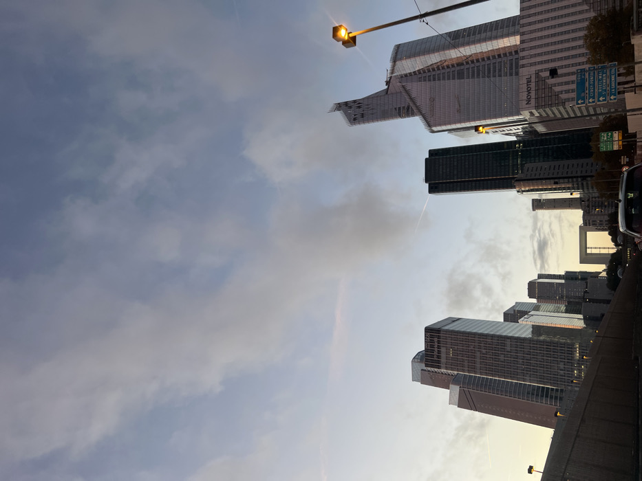 The image depicts an urban landscape at dusk or dawn, showcasing the La Défense business district as viewed from the Pont de Neuilly or its eastern approach in Neuilly-sur-Seine, France. The sky overhead is a gradient of light blue, pale pink, and grey, with scattered stratiform and cumulus clouds. A faint, white contrail is visible diagonally in the upper right quadrant. In the foreground, the top of a dark-colored vehicle is partially visible at the bottom center, from which the photograph appears to have been taken. To the immediate left, a dark, low-rise wall or barrier is present, possibly part of an elevated road or bridge structure. The midground and background are dominated by numerous modern skyscrapers. On the far right, a tall, slender glass and steel building with a distinctive angular, jagged roofline stands prominently, featuring "NOVOTEL" branding near its base. Adjacent to it on the left is another tall, dark, rectangular skyscraper. Further back and to the left, a dense cluster of various high-rise buildings with reflective facades are visible. In the distant background, centrally framed between the buildings, is the distinctive white, open-cube structure of the Grande Arche de la Défense. Artificial lighting from yellow-orange streetlights is active; one prominent streetlight pole with an illuminated lamp is on the far right. Additional lights from buildings are visible as glowing windows. On the right side of the roadway, a blue and white directional road sign is visible, displaying destinations such as "PONT DE NEUILLY", "RUEIL-MALMAISON", "GARE DE LA DEFENSE", "CIBY 4", and "Puteaux", confirming the location's proximity to these areas. No discernible individuals are present in the visible portion of the image. The scene conveys a sense of urban development and vehicular transit at a transitional time of day.