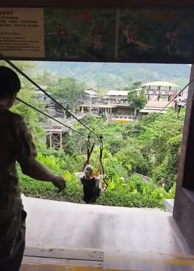 From the perspective of someone standing in a wooden, semi-enclosed area, a woman is seen zip-lining across a lush, green valley. The woman is wearing a dark vest and light-colored shirt. She is hanging securely from a harness attached to a zip line cable that stretches across the valley. Another person is at the platform preparing to zip line. The background features buildings with tan roofs nestled amongst the greenery. A sign with text in an Asian language, possibly Chinese, is visible on the wall. A man stands next to the camera, with his left arm raised, and wearing a green T-shirt.