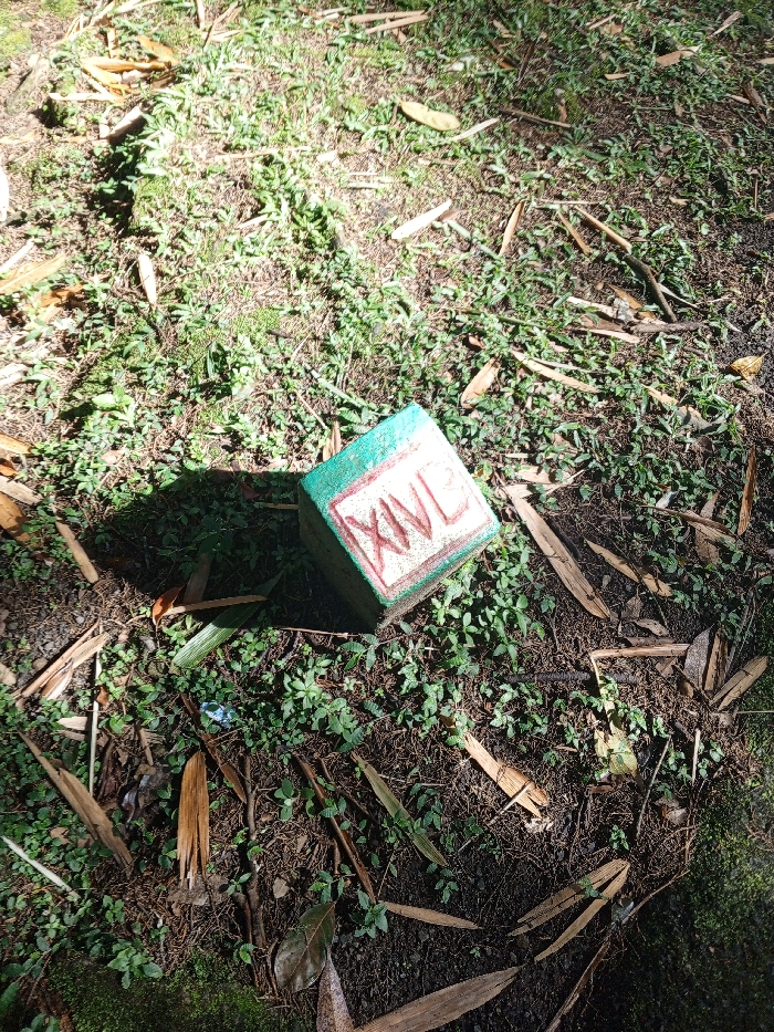 A square concrete marker with Roman numerals "XVI" is situated amidst ground cover, dry leaves, and twigs