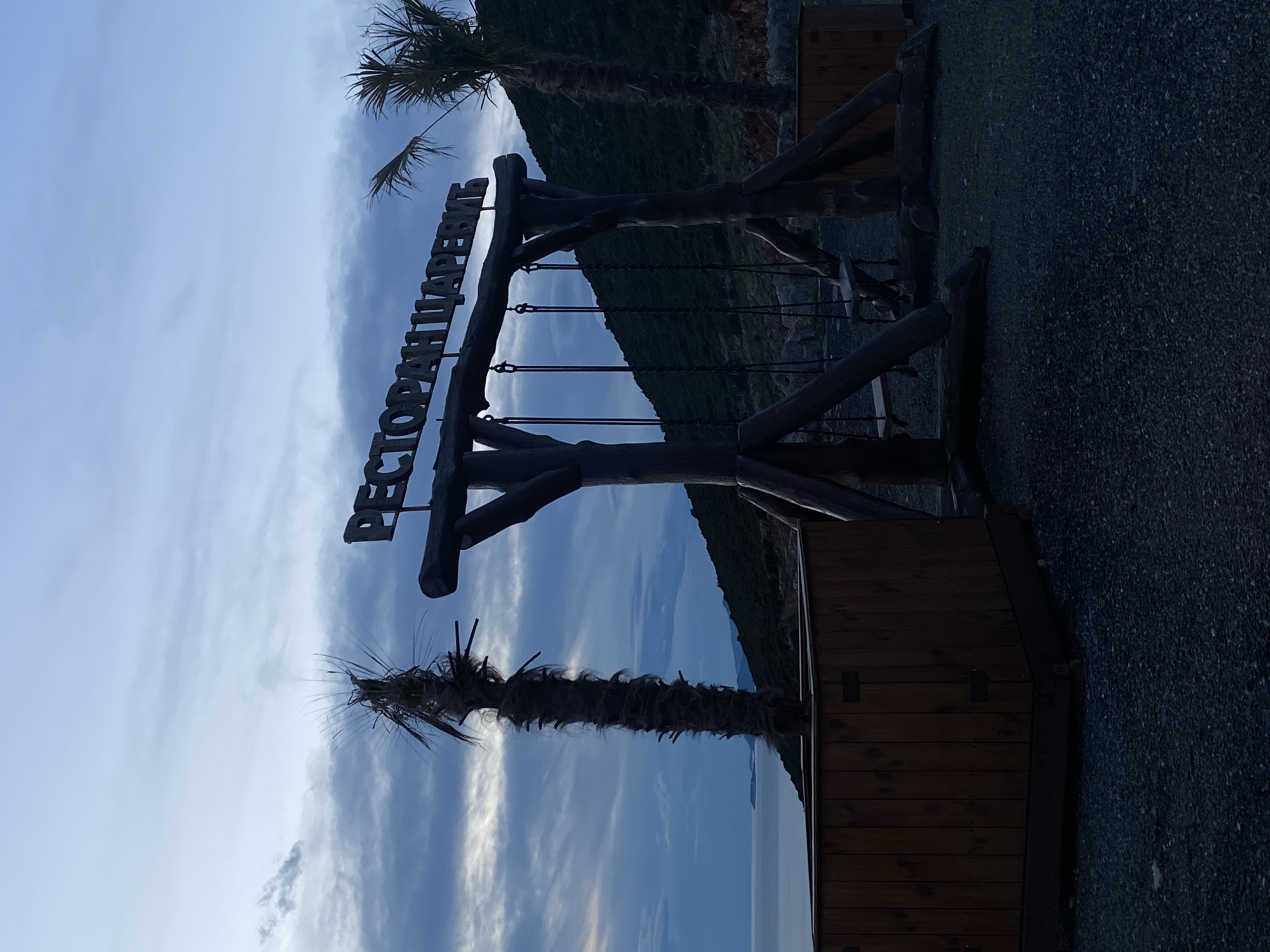 Captured in Kovačko Polje, Montenegro, the image presents a wooden sign standing beside a road. The sign, crafted from wood, displays text in Cyrillic script. Two palm trees flank the sign, one on either side. A wooden box-like structure supports the sign's base. Beyond the sign and its surroundings, a mountain range is visible, and the sky is filled with clouds.