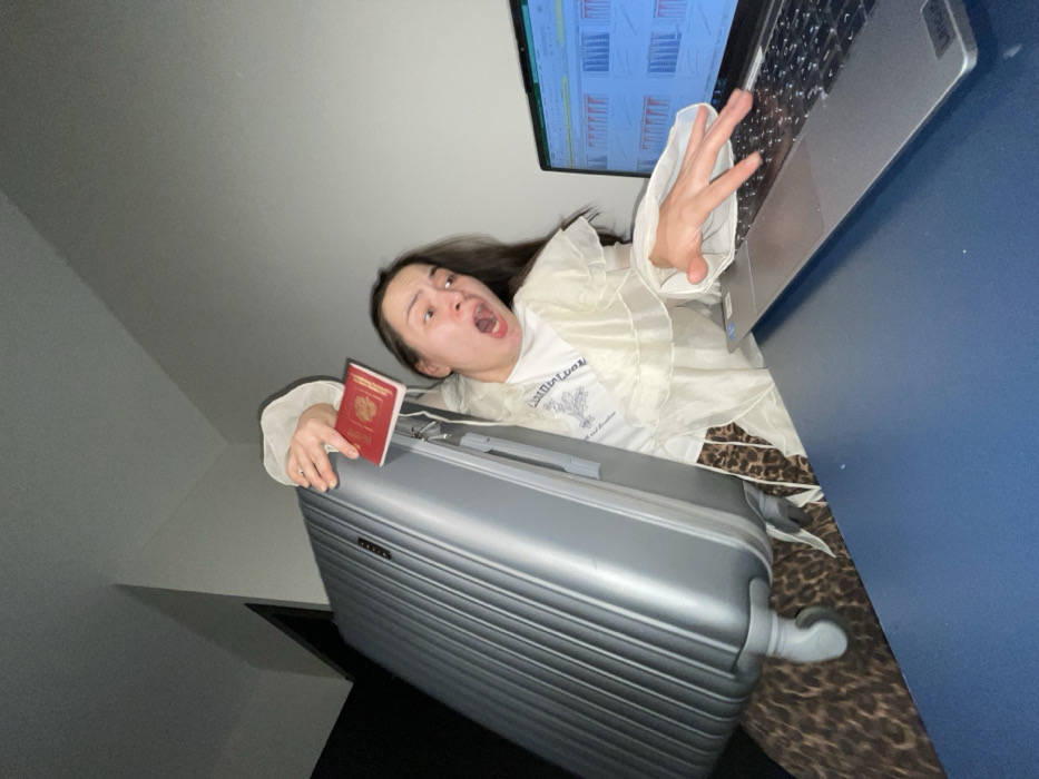 A woman is positioned in an exaggerated perspective, seemingly mid-fall while holding a red passport on a suitcase. A laptop displays a data chart near her outstretched hand. She wears a white t-shirt and a ruffled white top. The background includes a wall, presumably a bedroom, with a leopard print rug partially visible on the floor. The scene has an anxious, chaotic energy.