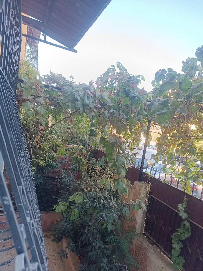 The image depicts an outdoor scene in Dahiyat Qudsaiya, Syria, observed from an elevated perspective, likely a balcony or terrace. On the far left, a dark-colored metal railing or balustrade extends vertically. Above and to the left, a section of a brown corrugated metal roof or awning is visible against a bright, clear sky. The central and right portions of the frame are dominated by dense green foliage, primarily large-leafed vines consistent with grapevines, forming an overhead canopy and trailing downwards, partially obscuring the background. Some leaves exhibit yellowing. Sunlight filters through the leaves from the right, creating bright highlights and lens flare. Below the main canopy, additional green undergrowth is present. A rust-colored metal fence or barrier runs horizontally across the lower mid-right, partially covered by vines. Beyond the foliage and fence, a street or parking area is visible in the background, containing multiple parked vehicles, including a white van and several cars. No individuals, explicit actions, or interactions are discernible.