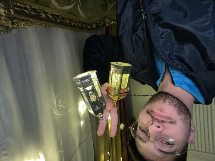 A male individual is depicted in a selfie-style photograph taken indoors in Sarouja Municipality, Syria. The subject has short dark hair, a beard, a mustache, and wears circular eyeglasses. He is dressed in a dark blue zip-up jacket over a light blue shirt. He holds two illuminated decorative lanterns in his right hand: one gold-colored with cut-out designs, and another dark-colored with metallic detailing. The background features light-colored curtains illuminated by warm yellow string lights, including a crescent moon and star decoration. In the lower right, an ornate piece of furniture with gold-colored carvings and green floral upholstery is partially visible.