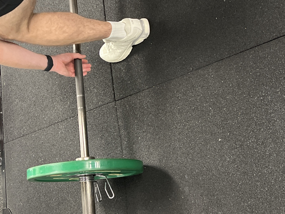 A person stands near a barbell with a green weight plate on a dark, textured floor. The individual's hand grips the barbell, and their foot, clad in a white shoe and sock, is positioned nearby. The barbell is silver, and a metal spring collar secures the weight plate. The floor's surface is speckled and slightly reflective.